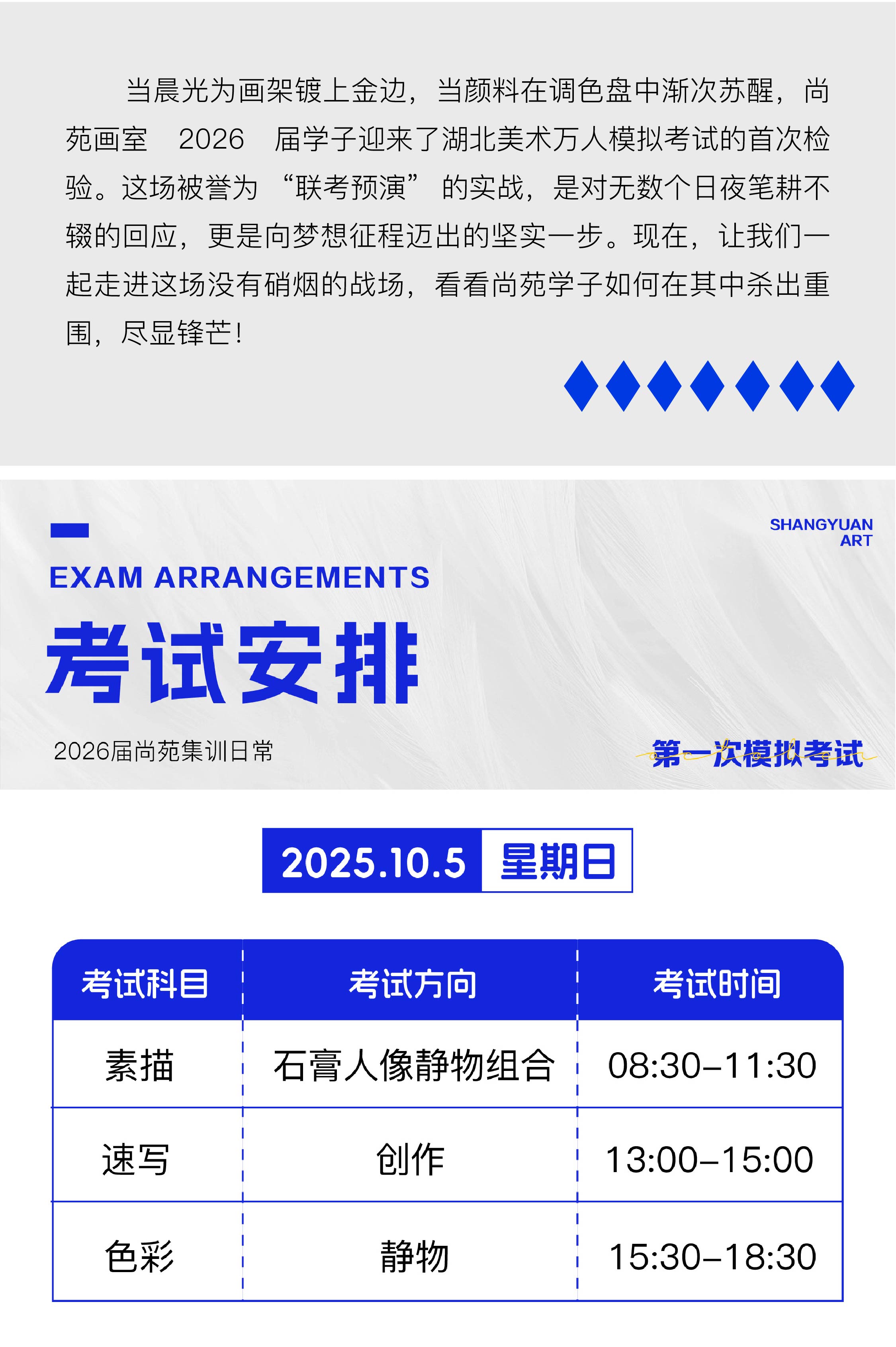 利剑出鞘,万人模考首战告捷 |尚苑画室2026届湖北美术万人模拟第一次考试全纪实情满中秋,暖在尚苑 | 尚苑画室祝大家中秋节快乐尚苑画室 | 2025届新生入学指南,新起点新梦想,新生入学必读!尚苑书法学堂 | 「书法高考集训招生简章」小班教学,名师领航!尚苑画室寝室篇 | 艺术与温馨的完美结合,给你家的温暖!尚苑五一校园开放日 | 名师试学,豪礼相送,弯道超车就等你!尚苑画室2025届美术高考集训报名正式开启!清明试学季 | 名师手把手解惑,免费试学大收获,领取多重好礼!家校同心,共筑成长阶梯 | 尚苑画室家长会圆满落幕2024年美术特长生周末班招生简章!校园参观日 | 2025届美术集训预报名火热开启,快来抢占名额…尚苑画室“温暖夜宵”助力艺考!举梦出征,统考大捷|2024届尚苑画室学子考前动员大会!尚苑基础部2024寒假班学员作品集 | 冬日里的画笔舞动,见证绘画的蜕变尚苑写生季 | 婺源山水游记,用笔描绘自然之美尚苑周考纪实 | 少年逐梦正当时!尚苑画室2024届师生拔河比赛|凝“绳”聚力,拔出精彩尚苑七月生日会|“以父母之心”陪伴你!尚苑画室2024预报名正式开启——五大优惠活动超值来袭!2023美术特长生周末班——春季种子计划学无止境,教无止境 | 尚苑×袁亮 素描教师内训湖美送考纪实 | 校考无畏,尚苑为你护航尚苑走进高中 | 资深艺考专家为您解读教育新政2023届尚苑新生开学典礼——优秀学员同获荣誉表彰,“六大禁令”共建秩序校园【尚苑画室】五一有礼送 “尚”!砸金蛋,送ipad,免学费!尚苑寒假班这组作品真的不错!结业快乐——尚苑画室基础部寒假班今日结业!打好基础,化零为整——尚苑高考一线名师为你逐梦护航尚苑2021基础部家长会 | 新形势,新规划,家校合力,筑梦未来!省文联、省美协专家组莅临尚苑画室,对重大历史题材创作进行第二阶段终审与指导如愿以偿,前程似锦丨回顾尚苑2021湖美全方位校考服务注重基础,分层教学 | 尚苑【基础部】期待与你一起奋勇向前!新出发,新希望,祝愿尚苑学子新的一年收获更多!全力以赴,力争上游 | 直击尚苑2021湖美校考模拟考试现场!MERRY CHRISTMAS | 星光点点,珠光闪闪,尚苑与你相伴!名师讲解 | 湖美陈国庆教授莅临尚苑画室进行范画指导尚苑名师王奎星 | 我爱艺术,而教育本身就是一门艺术尚苑一站式送考 | 风雨兼程,无悔逐梦行!蓄势待发,志在必得——预祝尚苑2021届全体学子统考大捷!爱心“胃”问丨艺考路上,我们一路相伴!尚苑学子成长日记——你的努力终将会有收获尚苑名师杨来元 | 因为热爱,所以选择,坚持。尚苑名师孙雪娇 | 求其上,得其中!求其中,得其下!锲而不舍,奋发图强丨尚苑2021届学子征战湖北省万人小联考(二模)未来可期 | 细数那些属于尚苑基础部师生的时光!尚苑名师专访:罗成 | 兴趣和热爱才是最好的老师!省文联、省美协专家组莅临尚苑画室,对重大历史题材创作项目进行初审与指导逐梦未来,为梦想而战丨尚苑2021届学子征战湖北省万人小联考勇往直前 | 尚苑画室2021届联考誓师大会“望 闻 问 切” 预防感冒 | 湖北省中医院国医堂樊医生为尚苑学子问诊尚苑 · 生日会 | 这次的生日愿望是希望通过联考,迈进理想的大学!分秒必争 | 见证2021届尚苑学子集训现场尚苑提升计划 | 尚苑2021届学子20天作品对比再接再励,勇往直前|尚苑画室21届月考颁奖典礼圆满落幕不忘初心,传承尊师文化,不负师恩——向可爱的老师们致敬!征战月考 初露头角|尚苑画室2021届学子首战月考2020尚苑画室秋季“奔跑吧,青春”主题团建之旅防患于未“燃”——尚苑画室2020年消防安全演练圆满结束8月第二次生日会 | 生日快乐!今天没有流星,同样可以许愿哦~梦想征程 | 记录尚苑画室追梦少年的一天【尚苑画室首届-节约日】| “节约用餐,从我做起”主题活动隆重开展【班主任篇】有一种“无所不能”的超人,叫班主任!追梦少年 初露头角 | 尚苑2021届新生征战周考新生集训课堂揭秘!愿同学们2020乘风破浪,未来可期尚苑·生日会 | 在外的陪伴,就是最好的生日礼物你好,领航员!尚苑画室2021届追梦新生前来报到!尚苑艺术绘馆·水彩之家 | 常设水彩画培训招生尚苑艺术绘馆·水彩之家 | 首发艺术展,完美开幕!尚苑2020年高考志愿填报指导会,为艺考生插上翅膀,助力大学!尚苑画室2021届新生入学指南尚苑画室2020届湖北美院校考送考服务复课在即,防疫先行!尚苑画室七大举措为学员打造健康安全校园家长必读 | 经常给孩子请假,您知道后果多严重吗?尚苑画室│美术生学习过程中的焦虑和低落,你一定也有,但你要坚持家在尚苑,凝心聚力 | 教师团队开展野外拓展活动 — 与大自然零距离接触!尚苑画室|教你解决美术生集训前期常遇到的五大问题!尚苑学子 | 心中有梦,砥砺前行!武汉尚苑画室户外拓展丨很高兴遇见你!尚苑画室高一、高二暑期作品集丨梦想与远方【安全课堂】武汉尚苑画室消防演练,我们有备无患!尚苑画室 | 2019届第一次月考在尚苑的24小时,看过的美术生都收藏了(下)七月July | 看看这一周,我们干了些什么?(上)开学 | 2019届尚苑画室“正式起航”武汉尚苑画室预祝所有高考考生,高考大捷!让你的暑期不一样,2018年尚苑暑期夏令营招生啦!!!美术基本知识:美术都有哪些分类关于美术高考:模式化美术训练中的弊病关于美术高考:美术类专业选择与发展方向美术各专业就业前景分析武汉尚苑